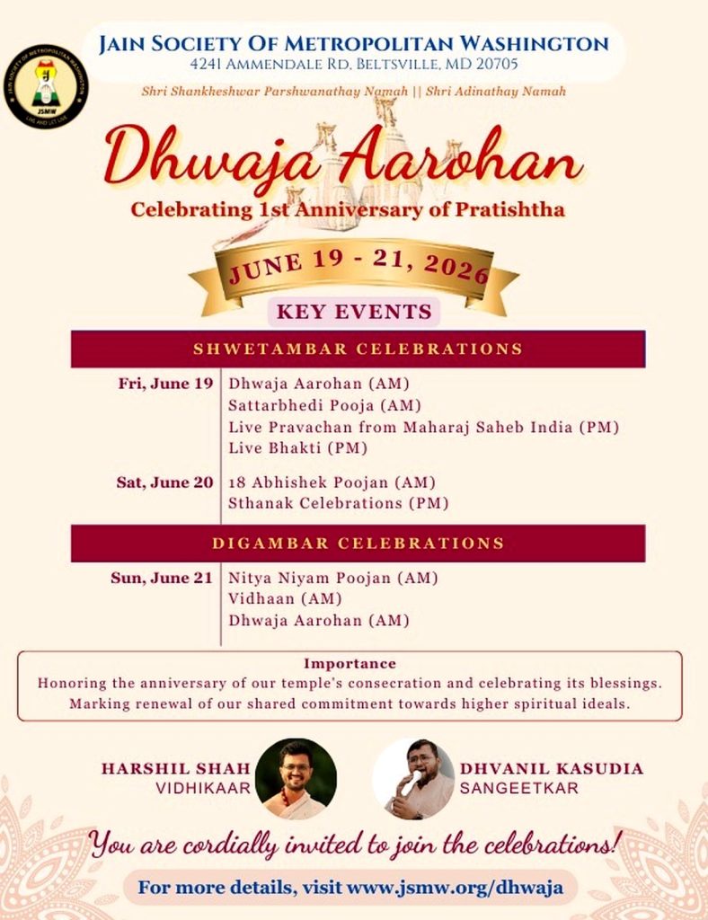 Soon it will be one year since our historic Pratishtha Mahotsav at the Jain Center. On the auspicious day of Jeth Sud Pacham, we will be celebrating the 1st Anniversary of Pratishtha with the sacred Dhwaja Aarohan ceremony.